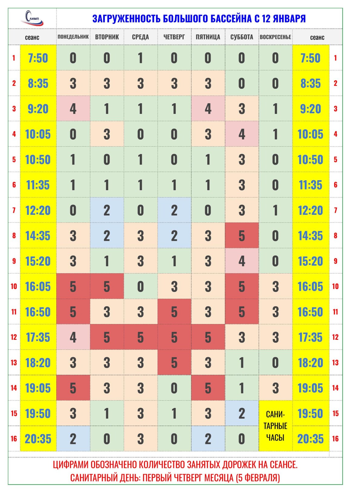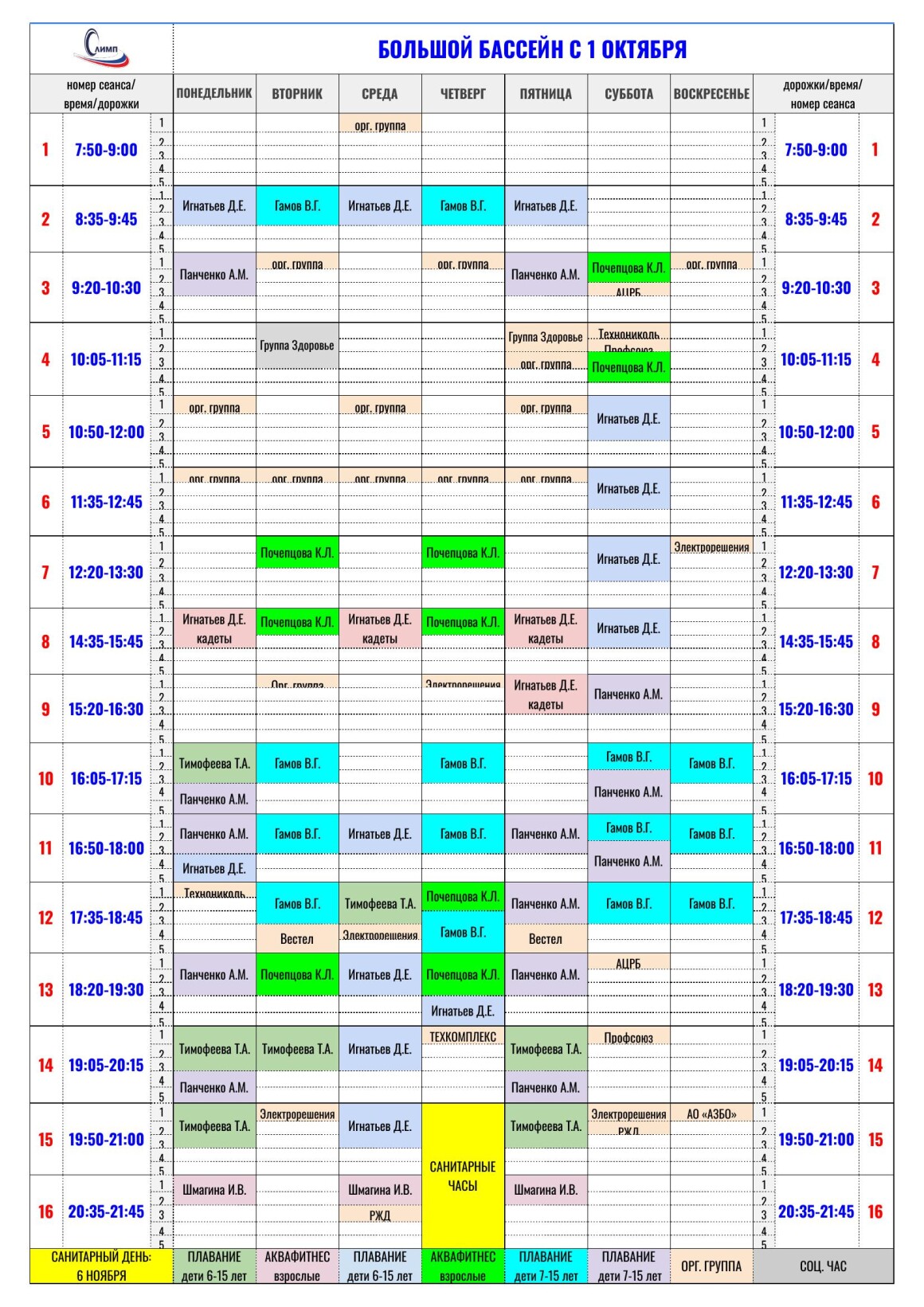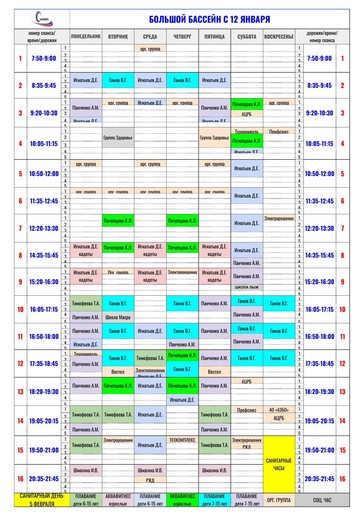 1.2. Занятия в бассейне проходят согласно расписанию. Расписание составляется еженедельно. Расписание сеансов бассейна действует для всех организованных групп, занятий с тренером, разовые посещения и посещение по абонементу. Информация о расписании по т. 8(49244) 69161, 69162, 69163, на информационном стенде и на сайте WWW.FOK33.RU